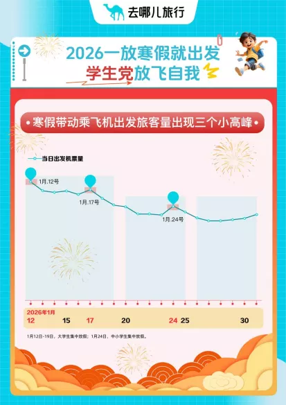 跟着本周宇宙高校开动放寒假,学生雄兵出行量快速增长,也带动春节出行预订开动启动。去哪儿旅行大数据潜入,本周全下周将迎来三波客流小岑岭。预订1月12日至1月19日动身的机票量环比上周增长昭彰,18-22岁游客环比增长近三成;1月24日,宇宙中小学生将麇集迎来寒假,带动1月24-25日成为出行小岑岭,0-17岁的儿童和青少年票量环比上周末翻番。