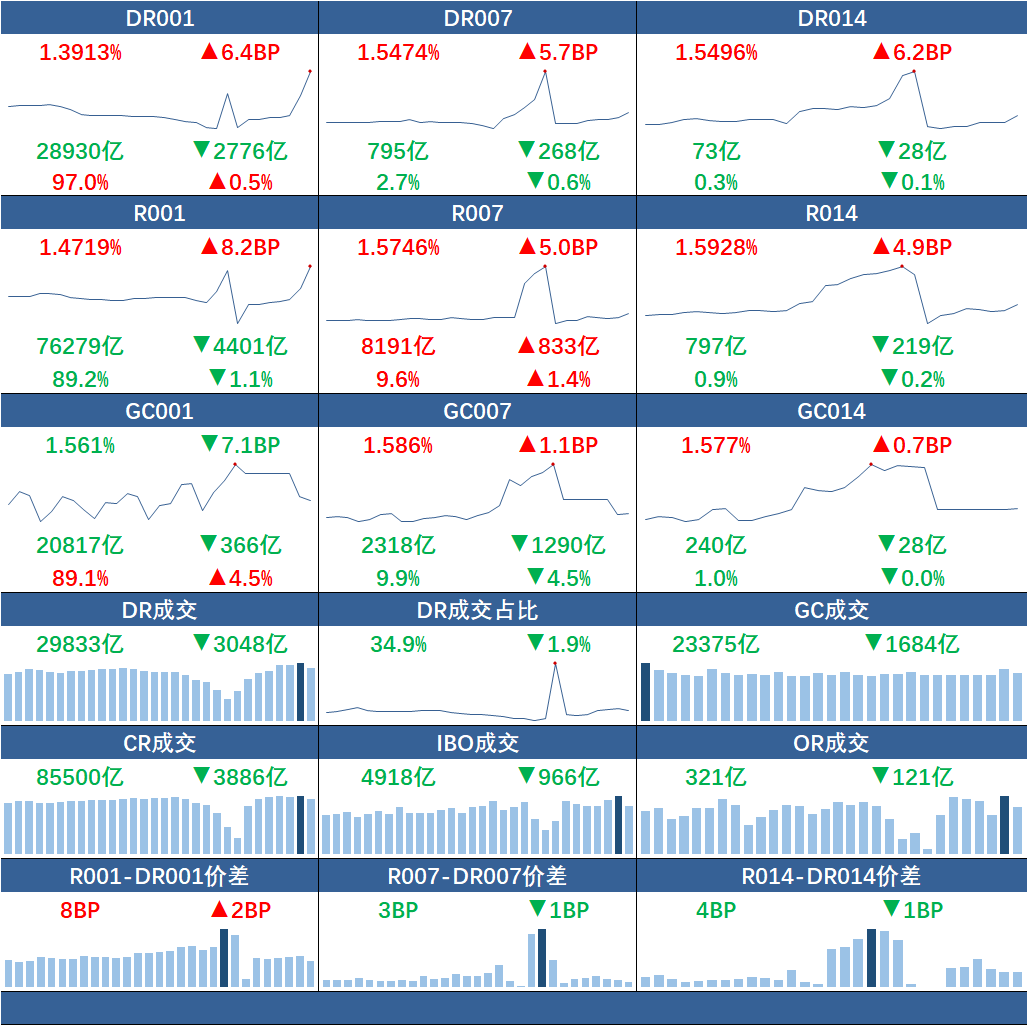 货币市集资金面平衡偏紧。当天成交85500亿元。DR001加权1.39%,较前日上行6BP,DR007加权1.55%,较前日上行6BP。